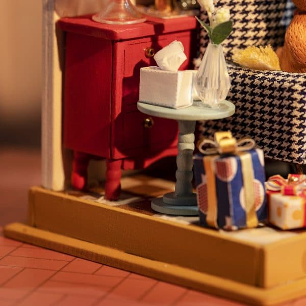 Holiday Living Room is a palm-size mini house. With vintage red and green as the main colors, it creates a cozy home atmosphere. Imagining sitting on the cozy sofa, watching a movie and opening gifts from friends, this scene makes people feel relaxed and comfortable.